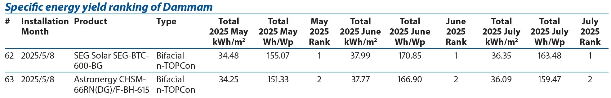 Table 1: Specific energy yield ranking of Dammam May to July 2025